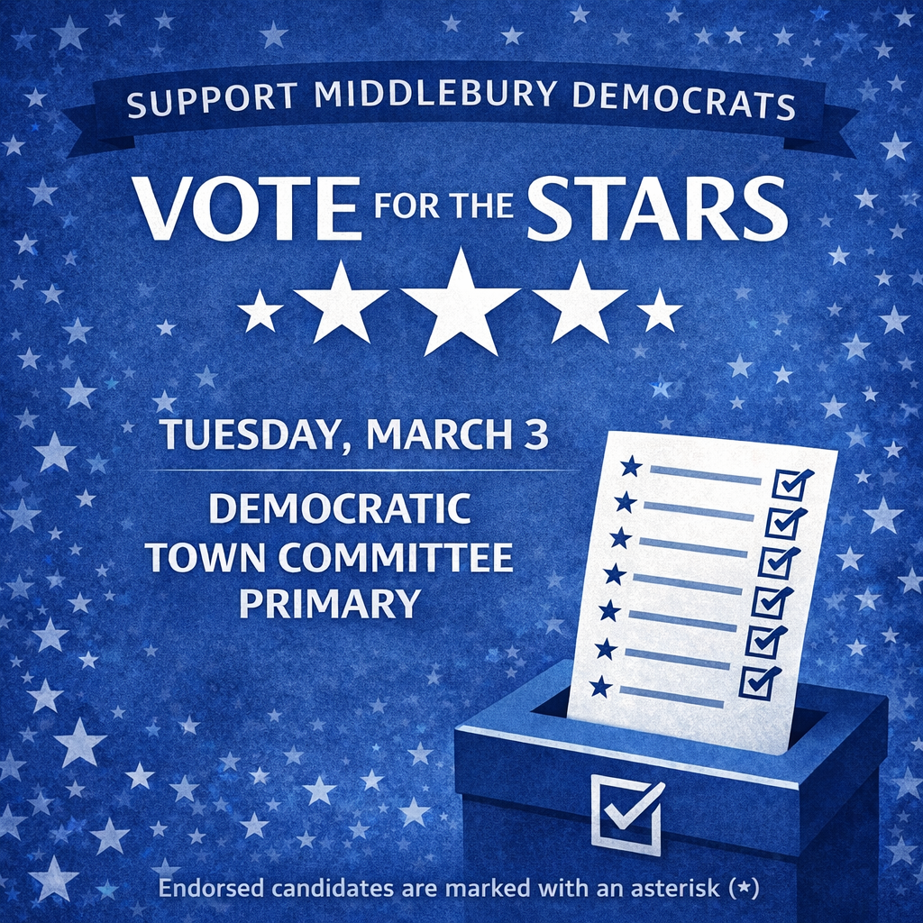 On Tuesday, March 3, registered Democrats in Middlebury will vote in a Democratic Town Committee (DTC) primary election. This election will determine who serves on Middlebury’s Democratic Town Committee moving forward, and we encourage Democrats to vote for the endorsed candidates—the first 25 names on the ballot marked with an asterisk (*), or as we say: Vote for the Stars.